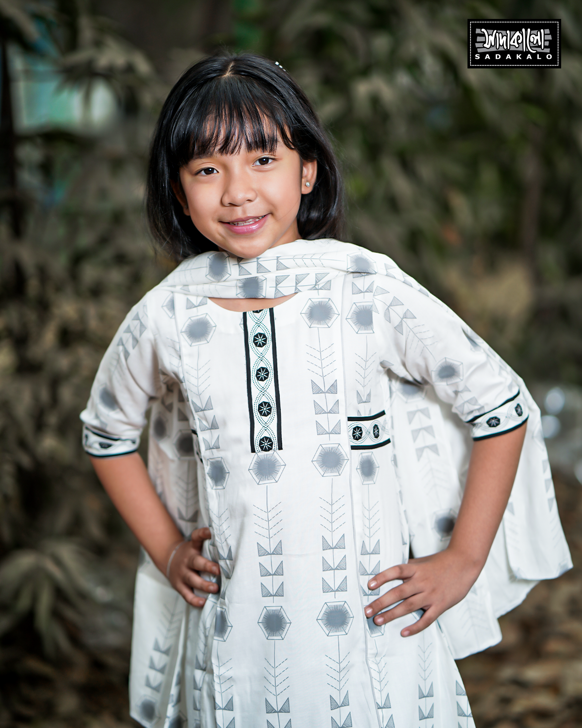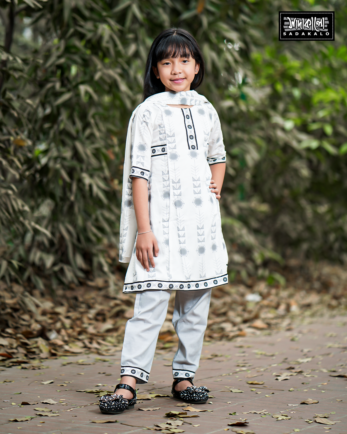 A premium quality white color baby Salwar Kameez that features a media screen design. A Salwar Kameez is a traditional South Asian outfit that consists of a tunic or shirt and loose-fitting pants.