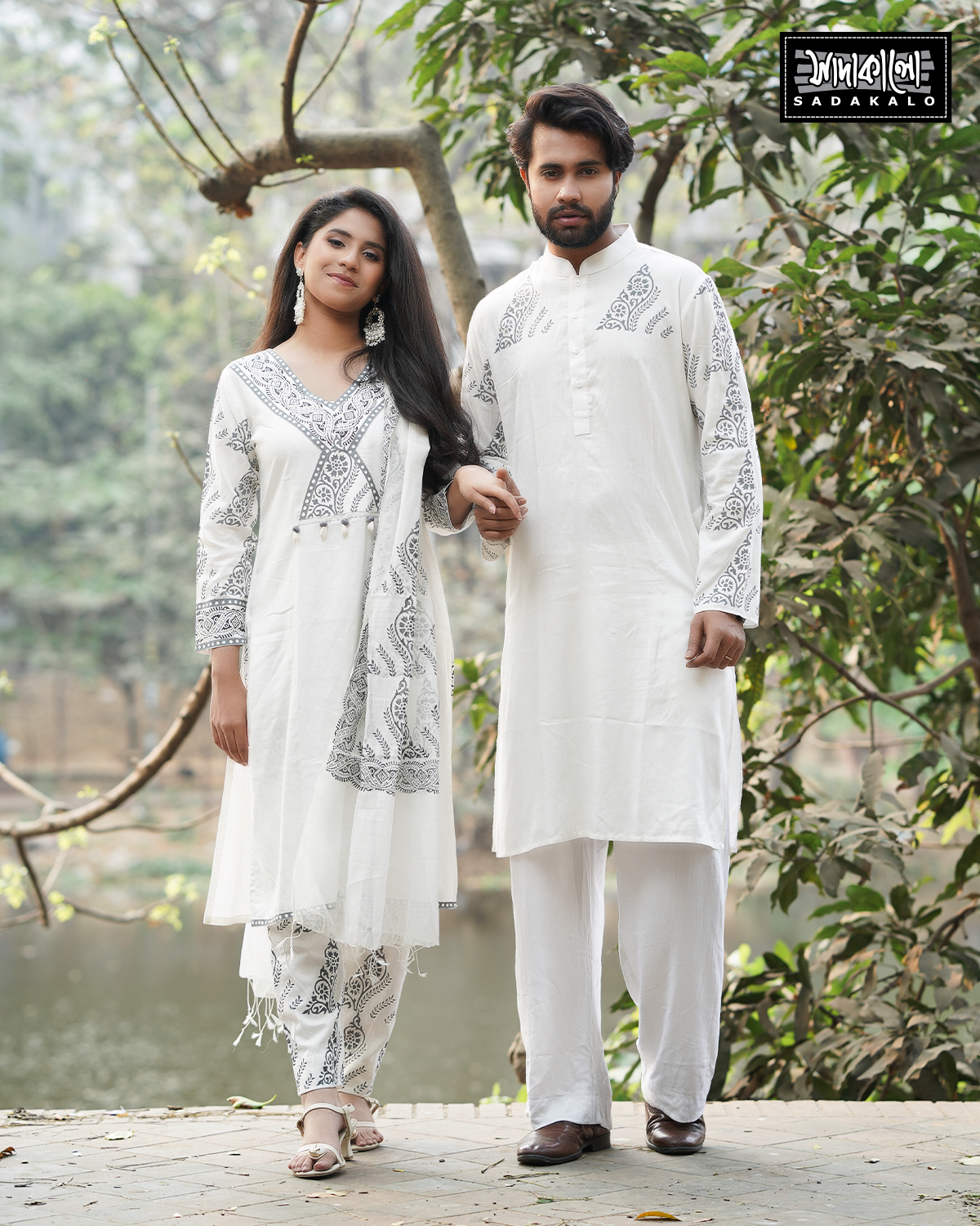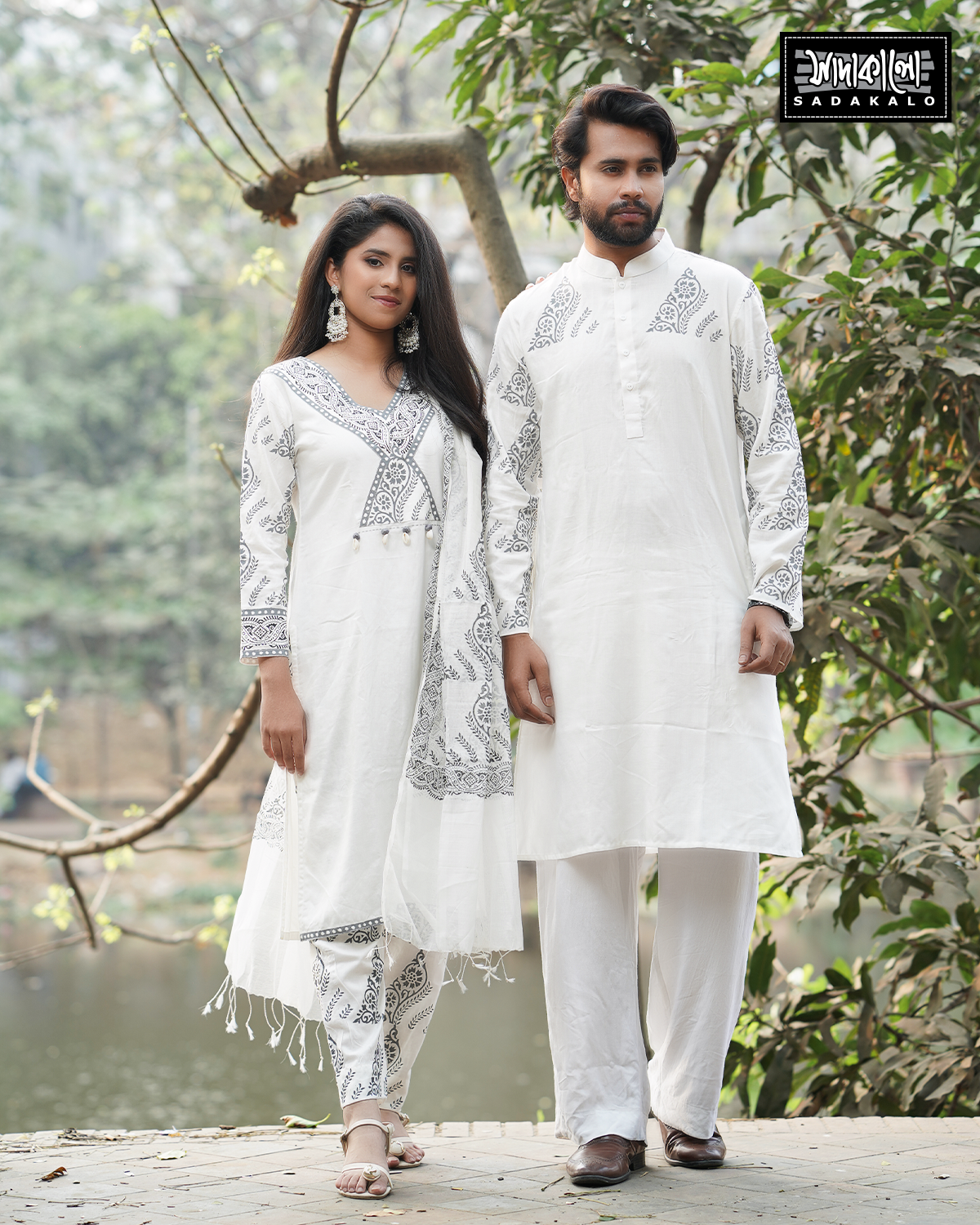 Styling Tip For a complete look, she can accessorize with statement silver jewelry, while he can pair the Punjabi with white Aligarhi pajamas or dark chinos for a sophisticated fusion vibe.